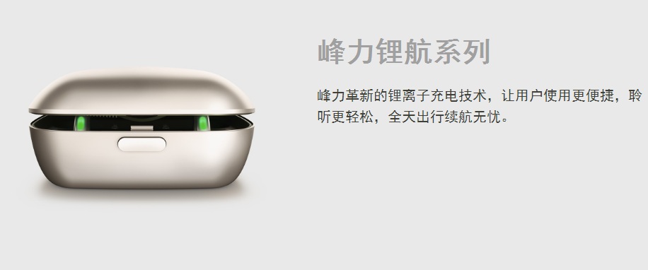 峰力锂航系列助听器采用革新的锂离子充电技术,一次充电可以满足全天轻松聆听,让您不再为电池余量及更换电池而担忧。同时提供人性化的充电方案选配,满足快速充电、移动充电等多种需求。